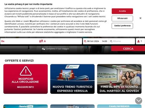 È il sito ufficiale di Trenitalia, la compagnia ferroviaria nazionale. Molteplici i servizi disponibili: ricercare gli orari dei treni, verificare le tariffe, prenotare e acquistare biglietti, modificare il biglietto, richiedere un rimborso, ecc. Presente anche una sezione offerte e servizi dove trovare sconti dedicati a ragazzi, offerte per le famiglie, a senior, abbonamenti e carte regalo.